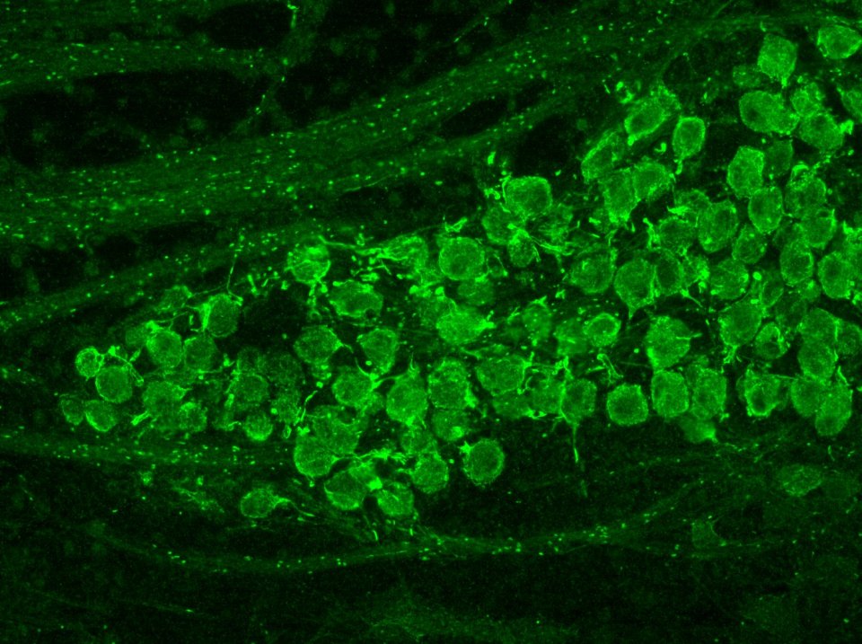 Kv3.1 in the MNTB, note the Kv1.3 puncta in the node of ranvier